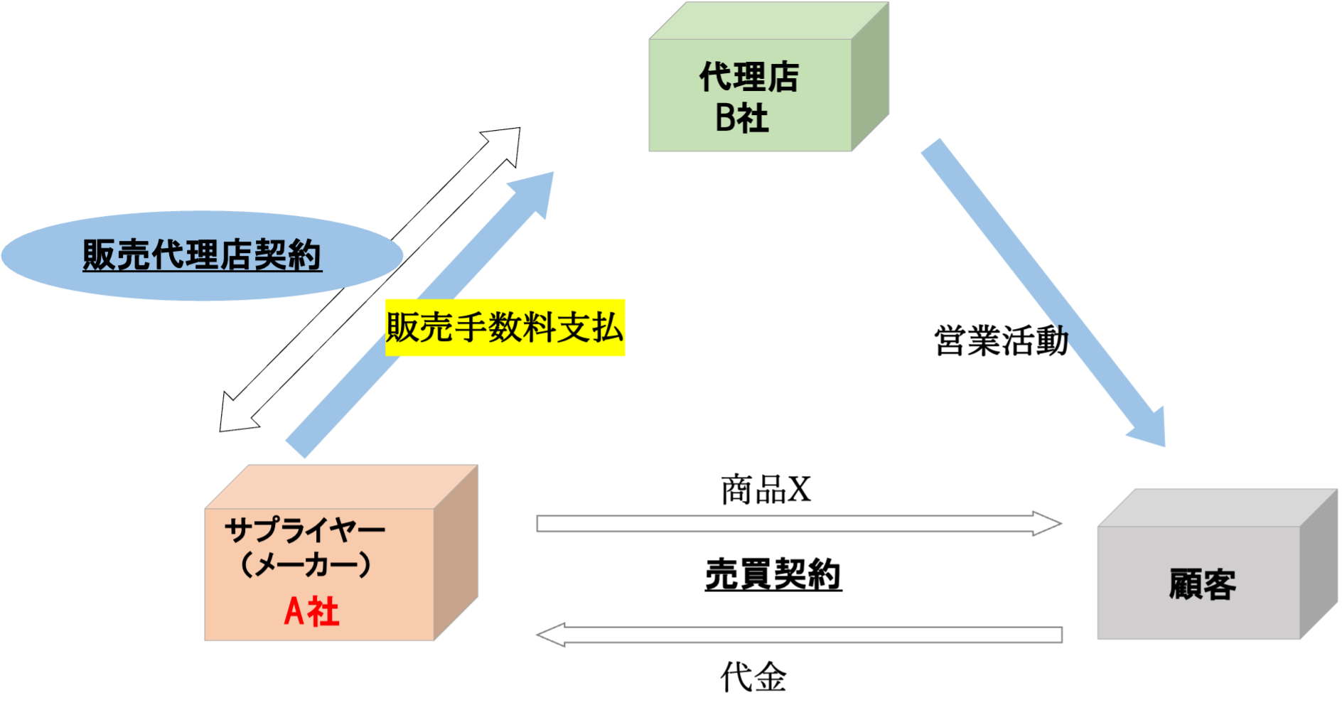 製造業である当社(A社)は、当社(A社)の商品Xについて販売ノウハウを持つ小売業者であるB社にも販売してもらいたい(販売する代理権を与えたい)と考えています。そこで、当社(A社)は、B社と販売代理店契約を結ぶことになりました。