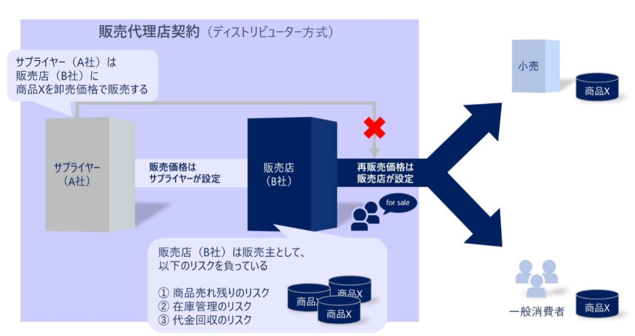 <本事例>では、A社(サプライヤー)とB社(販売店)とが、「販売代理店契約(ディストリビューター方式)」を結ぶ想定ですが、公取委相談事例では、下記のような取引形態が想定されています。