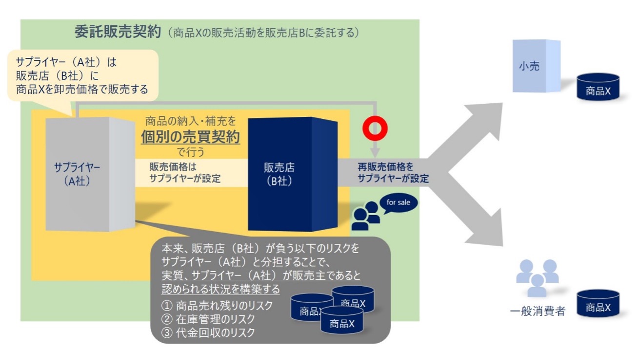 | 販売店が単なる取次ぎとして機能しており、実質的にみてサプライヤーが販売していると認められる状況であれば、サプライヤーが販売価格を要請したとしても、独占禁止法上問題にならない |